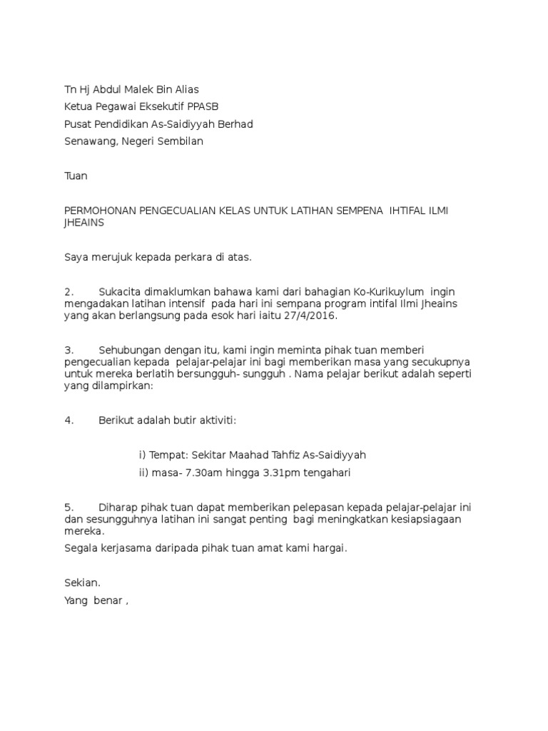 Comtoh Surat Mohon Pelepasan Pelajar Pdf